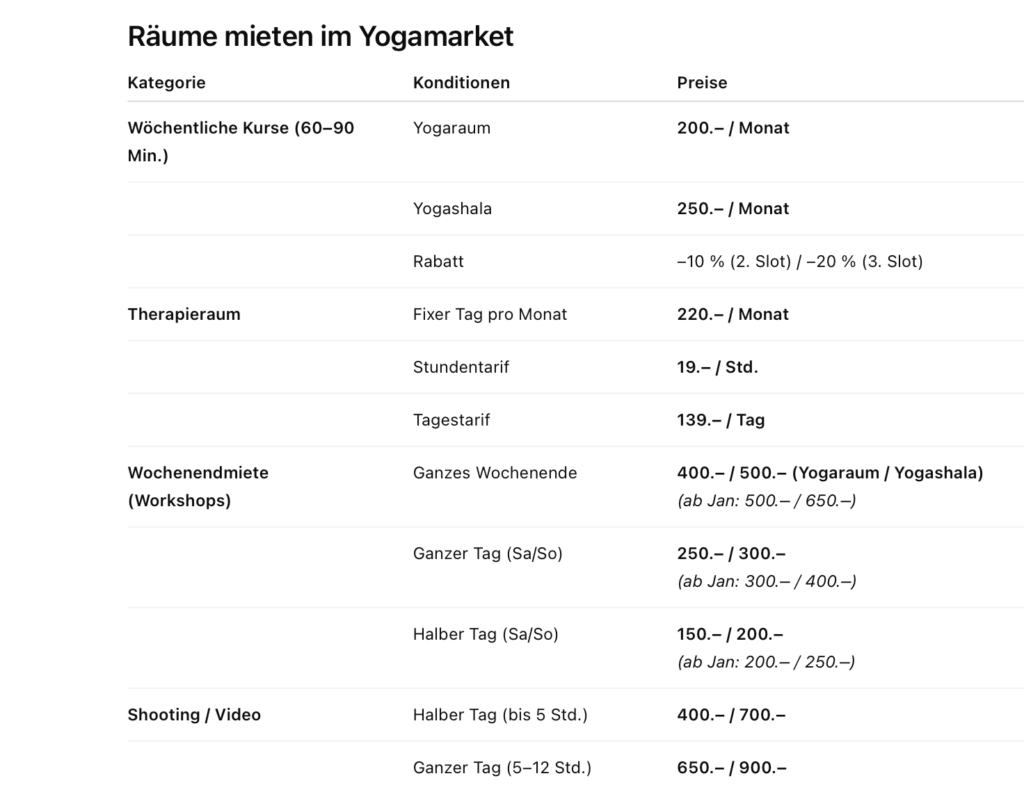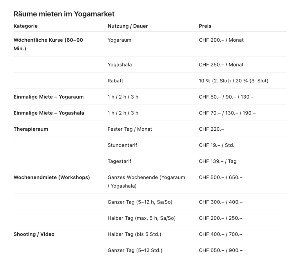 Schreib uns an info@yogamarket.ch oder komm vorbei – wir zeigen dir die Räume gerne persönlich und besprechen freie Zeitfenster.