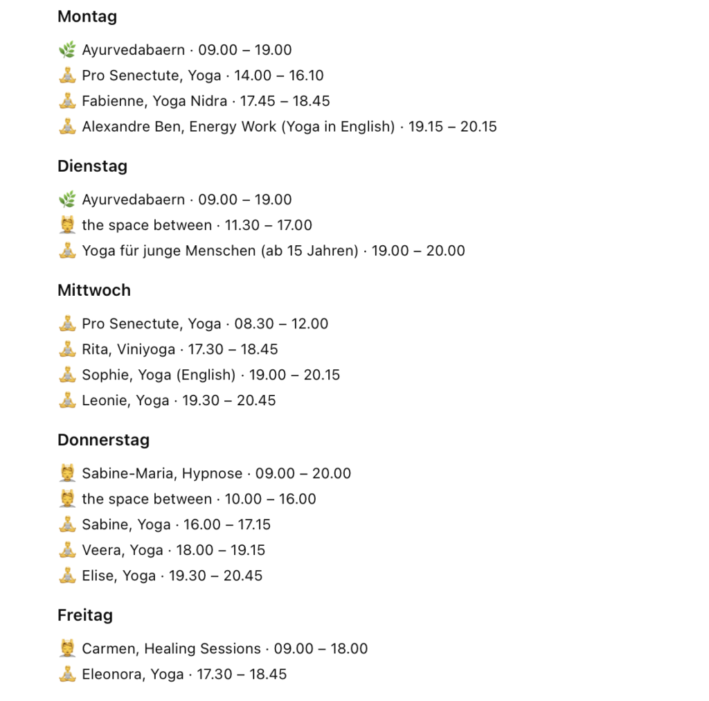 Unsere Räume werden für Yoga, Meditation, Therapie und weitere Angebote genutzt. Hier findest du den aktuellen Überblick über die fixen Zeiten im Yogamarket.